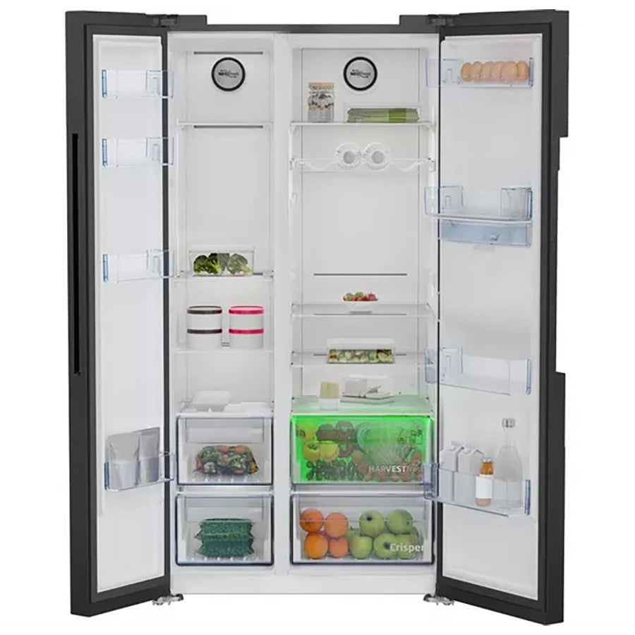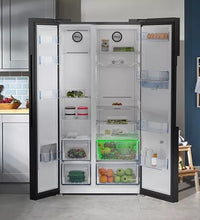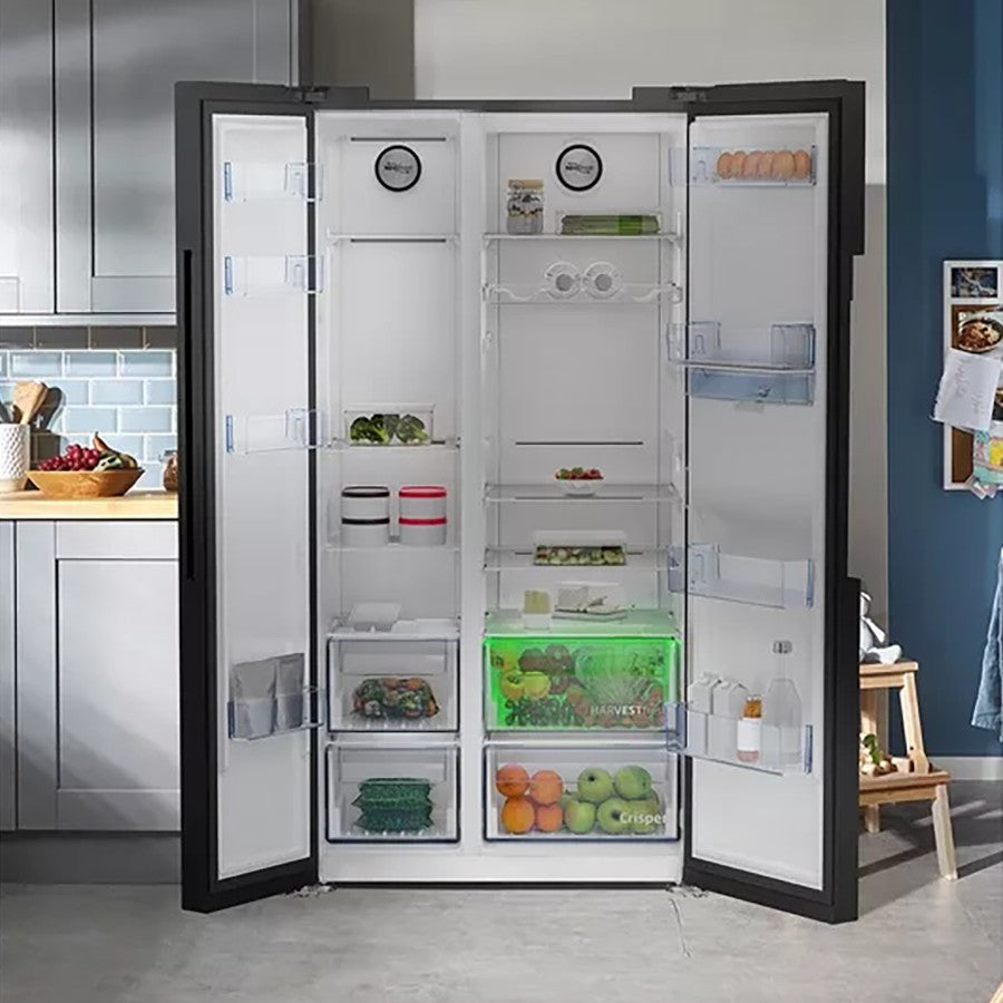With HarvestFresh™ technology, this Freestanding American Style Fridge Freezer preserves essential vitamins in your fruits and vegetables using advanced three-colour light technology to maintain their freshness longer. NeoFrost™ Dual Cooling ensures optimal humidity levels in the fridge and a dry environment in the freezer, preventing odour transfer. Additionally, the non-plumbed water dispenser offers the convenience of chilled water on demand.